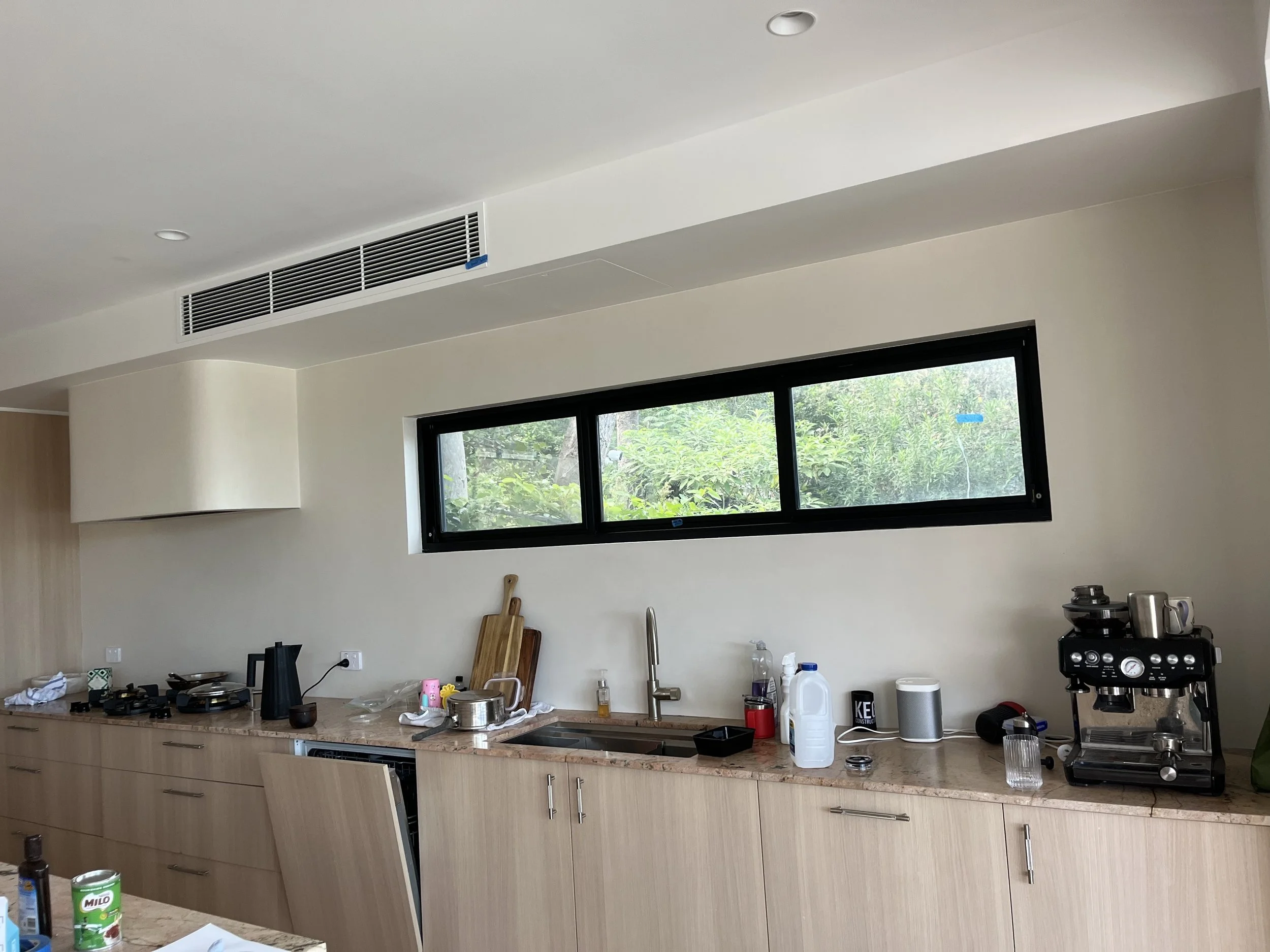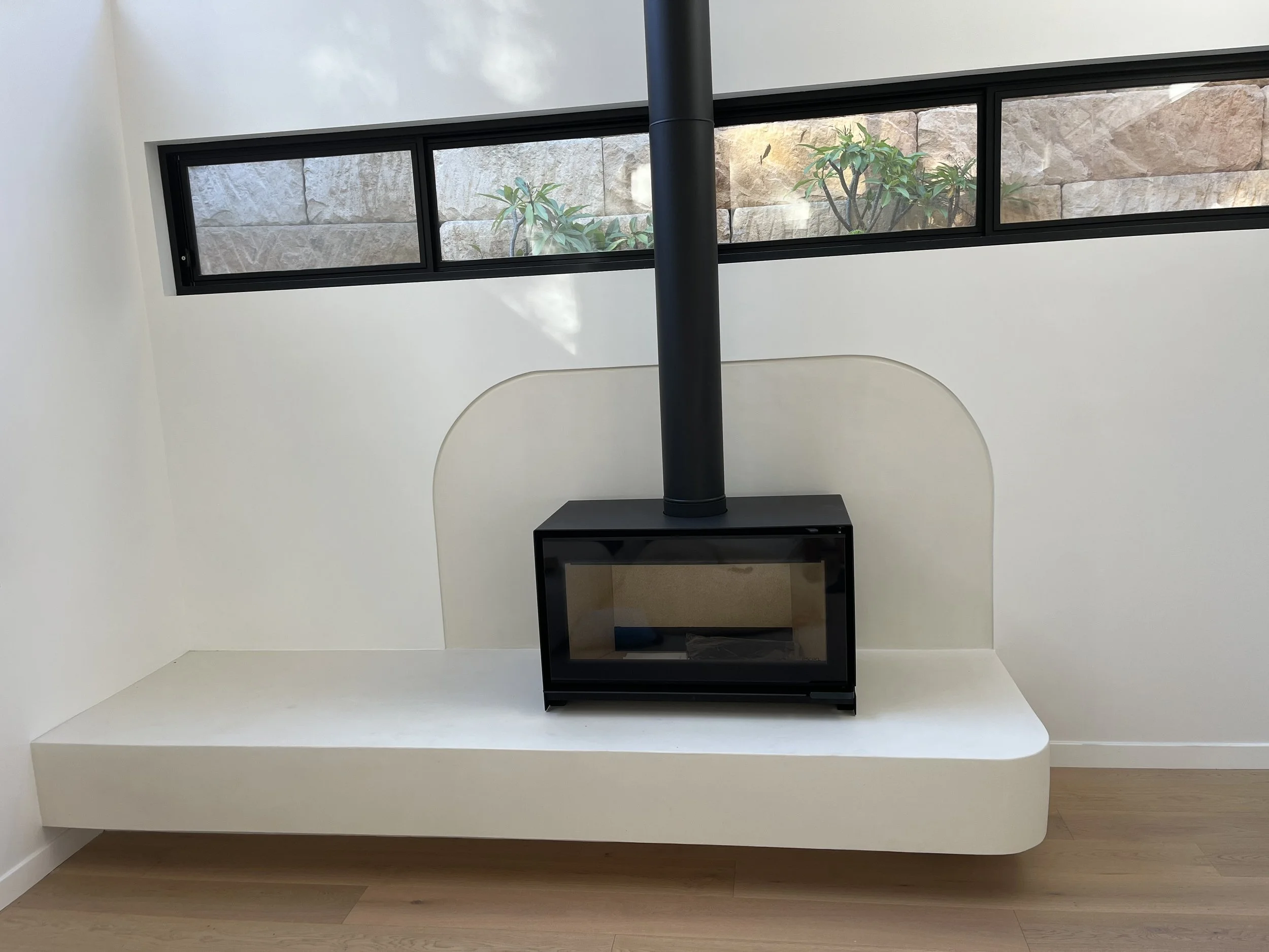 One of our recent Northern Beaches projects showcases exactly what microcement can achieve across multiple surfaces in a single home. We completed a full kitchen splashback and rangehood surround in microcement, creating a seamless, grout-free finish that ties together the entire kitchen. In the lounge room, we applied microcement over a built-in plywood heater stand structure — transforming a standard joinery piece into a striking concrete-look feature that became the centrepiece of the room. The result is a cohesive, contemporary finish throughout that our client absolutely loves.